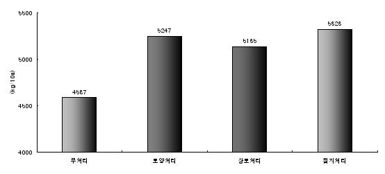 À§ ó¸® À°¹¦»ó¿¡¼ ¸ðÀ߷Ϻ´ ¹æÁ¦ ½ÃÇèÀ» ÇÑ ÈÄ Ã³¸®º°·Î Æ÷Àå¿¡ Á¤½ÄÇÏ¿© ¹Ì»ý¹°Ã³¸®¿¡ ÀÇÇÑ »ýÀ°ÃËÁøÈ¿°ú¸¦ Á¶»çÇÑ °á°ú ÃÊÀå, ¿±ÃÊÀå, ¿±ÃÊ°æ ¸ðµÎ ¹«Ã³¸®¿¡ ºñÇØ »ýÀ°ÀÌ ÁÁ¾ÒÀ¸¸ç, ±¸ÀÇ ¹«°Ô ¹× Á÷°æ ¶ÇÇÑ ´õ ÁÁ¾Ò´Ù. ±×¸®°í ÃÑ ¼öÈ®·®¿¡¼µµ ¹«Ã³¸® 4,587/10a¿¡ ºñÇØ ħÁö ó¸® 5,323/10a·Î 16%ÀÇ Áõ¼ö È¿°ú°¡ ÀÖ¾ú´Ù (±×¸² 4).
